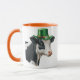 St. Patrick's Day mug featuring a watercolor image of a black and white cow adorned in a green top hat with a gold band and a white flower and shamrocks. Three small green shamrocks in front side of mug. Additional sizes and rim and handle colours available.