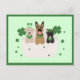 Three dogs popping out of a letter surrounded by lucky four leaf clovers. Perfect for St. Patrick's day.
