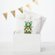 This charming watercolor-style artwork celebrates St. Patrick's Day with a whimsical touch. At the heart of the image is a quaint green house with a thatched roof, complete with tiny windows, a green door, and surrounded by lively clovers and lush greenery. Above the house, a large green gingham bow adorned with delicate lace detailing adds a festive flair, tying together the holiday spirit in a soft, artistic presentation.