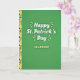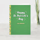 This greeting card features a rich green background with a smooth vertical gradient that shifts from deep forest green at the bottom to brighter emerald near the top. Centered in the middle, the text “Happy St. Patrick’s Day” appears in white with a soft drop shadow that gives it a lifted look against the green. On both sides of the main message, radiating arrow-like accents point inward, adding a lively, celebratory feel ☘️. Just below, “GRANDSON” is set in a warm golden-yellow with its own subtle shadow, like a friendly callout meant for someone close. The layout feels affectionate through its gentle spacing and the way the decorative marks seem to frame the words like an embrace 💚. Along the left edge, a vertical stripe in pale chartreuse runs from top to bottom, acting as a neat border. Over that stripe, stylized shamrocks stack in a row, colored in olive, deep teal, burnt orange, and soft yellow.