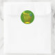 Round St. Patrick's Day harp and shamrock sticker in green and gold.