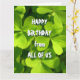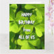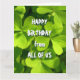 Green clovers, extra large, St. Patrick's Day birthday card from all of us. Custom text on the front "happy birthday from all of us" can be changed, and personalize with the birthday boy, or girl's, name in the greeting / message inside. This large card give everyone lots of room to sign, or choose the smaller size.