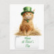 Celebrate in true Irish style on Saint Partick's Day with this postcard featuring a beautiful orange cat sitting on a pile of straw. The cat is wearing a green hat, typically associated with St. Patrick's Day. Below the cat, there is a white card with green text that reads: "Happy St Patrick's Day." written in green cursive font. The combination of the traditional Irish symbol of the harp with the festive greeting makes this image both elegant and celebratory.