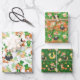 This set of wrapping paper features a lad and lass dressed in green with hats, with a pot of gold, a lucky horseshoe, and a cute orange cat. In different designs on a white background, a green background, and an orange and green background. This would especially be cute to wrap a child's gift.