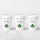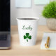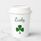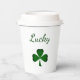 St. Patrick's Day lucky paper cup, with a green shamrocks design on a white background. With green script typography lettering, you can customize with your own text. Great for your St. Patrick's Day party or celebration.
