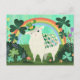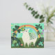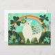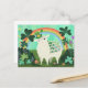 A fluffy white sheep dressed in festive green garb and warm multi-coloured jacket is surrounded by magical green clovers and spring bloom. A rainbow appears brightly in the background.