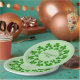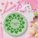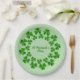 Paper party plates for St. Patrick's Day with green shamrock in a circle against a lighter green background.