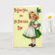 This card shows a vintage-style scene of a cherubic little girl with golden curls peeking out from under a bright white hat topped with a green bow. Her blue eyes, rosy cheeks, and gentle smile feel like she’s greeting someone she cares about, like a close friend or a favorite relative. She wears a rich green pinafore over a white blouse with puffed sleeves, finished with a ruffled white apron that adds a soft, old-fashioned touch. Tucked in her left arm is a small white woven basket brimming with green shamrocks, giving the picture a fresh St. Patrick’s Day focus ☘️. Along the left side, the message “To Greet You on St. Patrick’s Day” is set in ruby-red lettering that stands out clearly. The background is a warm, buttery yellow that makes the green outfit and shamrocks pop while keeping the scene gentle and cozy 💚. The girl stands centered on the card, with the red text aligned vertically to her left and the basket of shamrocks angled slightly forward.