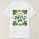 Happy St. Patrick's Day, on a White T-Shirt with the text surrounded with golden green shamrocks clovers