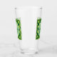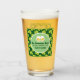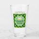 A St. Patrick's Day beer glass which says official drinking team with a personalized name. Illustrated with 2 mugs of beer inside a green circle. A repeating pattern with clovers in the background.