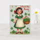 This card shows a sweet, cherubic young girl centered on a softly textured light grey‑green background, with small shamrocks scattered around her like confetti ☘️. Gentle, diffused light picks up her rosy cheeks and the tender, welcoming look in her wide brown eyes, as if she’s greeting a close friend. She wears a deep forest‑green dress with puffed sleeves, a crisp white Peter Pan collar, and a lightly ruffled apron that adds a cozy, old‑fashioned touch 💚. Bright red ribbons form neat bows in her curly dark hair and at her neck, giving a warm contrast to all the green. In one arm she carries a woven basket overflowing with four‑leaf shamrocks, and in her left hand she holds a single sprig forward like a small offering. The lettering sits across the top, with a large “A” in the upper left and the phrase “St. Patrick’s Day Message” in red on the upper right. The top text is balanced above her head, while the floating shamrocks dot the space around her dress and basket.