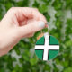 Keychain with design with a flag of historic county of Devon, in England, Great Britain; green flag with a white cross with a black border