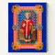 In this glorious representation, St. Thomas Becket, Archbishop of Canterbury, stands before an altar dressed for Mass. The altar is probably intended for St. Benedict’s near which—not at which--he was assassinated on 29 December 1170. It is a formal portrait, that is, the subject appears posed. Becket wears a bright red chasuble over a blue-green dalmatic and white alb. Over the chasuble, he wears his metropolitan pallium—a garment symbolic of his office as an archbishop who presides over an ecclesiastical province composed of several dioceses. The pallium is ornamented with 11 visible patée crosses rather than the more usual 5 visible crosses. (During the Middle Ages there was no definite rule regulating the number of crosses used.) St. Thomas cradles his mitre in the crook of his right arm and carries his archiepiscopal cross in his left hand. A gash in his forehead, a palm of martyrdom, and the blood-red chasuble in the liturgical colour for martyrs allude to his assassination. There is not a sword in sight—not even one laying on the floor at his feet. His name in Latin (Thomas Cantuariensis, that is Thomas of Canterbury) vertically flanks his figure in the aqua and sapphire blue chequered background. The whole is contained in a framework of Celtic design. +