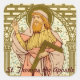 St. Thomas the Apostle, also called Didymus (the "twin"), was one of the Twelve Apostles of Jesus Christ according to the New Testament. After initially doubting the Resurrection until he touched Christ's wounds for himself, St. Thomas went on to evangelize Parthia, Persia, and India with missionary zeal. Here, he holds a builder's square. This attribute has several explanations both literal and symbolic. In one origin story, he erects the very first church building in India with his own hands. In another, he builds a palace for an Indian ruler; in its variant, he gives away his fee to the poor explaining away the actual palace as one of Christ's promised mansions in heaven. The third explanation is merely symbolic of building the Church in India on a strong spiritual foundation. + Image Source (RLS 18): Antique image in chromolithography with gilt accents of St. Thomas the Apostle from Red Letter Saints: Being a Series of Biographies of those Saints for which Proper Collects, Epistles and Gospels are appointed in the Book of Common Prayer. Printed by E. Kaufmann, Lahr, Baden, Germany, for the Society for Promoting Christian Knowledge / S.P.C.K. (London, 1911), p. 8. From the designer’s private library. + Feast: July 3 + Text is in dark red-brown (#460000) which matches the figure's outline.