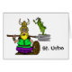 In this design, St. Urho is dealing with a sassy grasshopper who sits on top his pitchfork and is giving the "Peace" sign with his right hand. St. Urho pitched his fork at those grasshoppers and scared them out of Finland and saved the grapes. Who knew that mighty act would make him a hero? This is a fun card to send to all your friends, whether Finnish or not. Feel free to customize this as you wish.