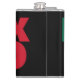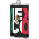 Stylish flask features Mexico spelled out with large stacked letters that have the country's national flag as fill, with black background.