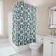 This shower curtain has a mid-century modern design of rectangles stack three thick in cool colours of blues, greens, and purples on a field of white. Want the same design with different colours? Message me.