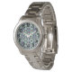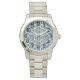 This women's watch has a mid-century modern design of rectangles stack three thick in cool colours of blues, greens, and purples on a field of white. Want the same design with different colours? Message me.