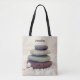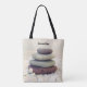 Tote bag with a photograph featuring rocks stacks on top of each other. Surrounded by loose white rocks and little white flowers.