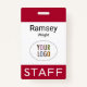 Personalize our professional staff lanyard badge with your company logo, employee name, or other custom text. It's pvc plastic and available with a lanyard, clip, or a retractable reel. This is a dark red name badge with a modern minimalist design. You can easily customize the colours, fonts, and design. No minimum order quantity and no setup fee.