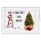 Une carte de Noël humoristique représentant un chien de tirier taureau du staffordshire portant un chapeau de santa et une cravate d'arc. Souhaitez des vacances qui valent le détour !
