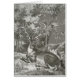 A deer, stag, lying on the ground in a forest. Vintage, antique illustration.