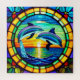 Colourful stained glass artwork featuring two dolphins jumping in a vibrant ocean sunrise setting, surrounded by intricate patterns of flowers and geometric shapes, encapsulating beauty and marine life.