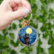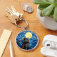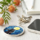 Reminiscent of Vincent Van Gogh's Starry Night, this black cat relaxes against a starry night cityscape.