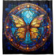 Bring elegance and tranquillity to your space with this stunning shower curtain featuring a stained glass-style butterfly. Gracefully centred within a circular frame and accented by soft circular motifs in each corner, the design evokes harmony and balance. Rendered in a rich palette of blues, champagne reds and golden hues and framed in black. The butterfly’s delicate wings shimmer with light and warmth, making it a perfect focal point for your bathroom. Printed on high-quality material, this piece combines the timeless beauty of stained glass with a modern, sleek presentation—ideal for adding a touch of nature-inspired sophistication to your home.