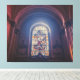The image captures a large stained glass window in a church, bathed in soft, warm light. The window depicts a biblical scene with several figures, likely representing a religious story. The colours are vibrant and rich, with shades of red, blue, yellow, and green dominating the scene. The window is framed by an arched doorway, with ornate details on the surrounding walls.