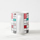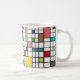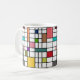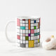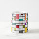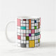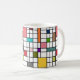 This mug has a mid-century modern design of a grid of black lines with squares and rectangles in retro colours on a field of white.