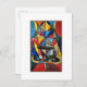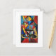 This postcard highlights the bold beauty of stained glass through a coffee-inspired design. Geometric lines and flowing curves divide the artwork into vibrant segments of red, gold, green, blue, light blue, orange, and brown. Random white splatters add a wintery charm, enhancing the look of a glowing stained-glass window. A striking piece to send as a thoughtful message or keep as a mini work of art.