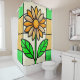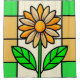 a stained glass window illustration of a yellow and white daisy with green leaves.