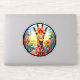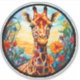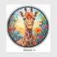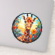 Colourful round laptop decal features a round AI-generated giraffe and floral portrait in stained glass. Great for cars, skateboards, lockers and more!