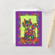 This unique and colourful cat sits against a spring green background and gazes at the viewer, showing off her multi-coloured mosaic-like markings that resemble stained glass. The entire scene is surrounded by a detailed multicolored border that matches her markings.