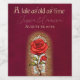 The background is an antique looking burgundy red parchment paper design, encircled with a gold frame. An image of a stained glass red rose is placed on the left, accented with a gold glitter pattern. "A tale as old as time" from the classic fairytale is printed at the top in a medieval style font. Two sample names are printed in an elegant script font, followed by a sample wedding date. You can personalize the labels to include your own names or other custom text.