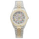 This women's watch has a mid-century modern design of a grid of black lines with squares and rectangles in retro colours on a field of white.