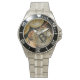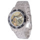 Has heft and feel of expensive stainless steel quartz watches. Good band with safety catch. I removed links, which is easy because engraved arrows show direction to push the linking pins. As always by this seller, the image (a railroad logo) is a perfect reproduction of my emailed image, and is precisely spaced and aligned.