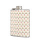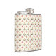 "Stainless steel flask with a pattern of small, stylized red and green floral motifs on a white background. The design is featured on both the front and left sides of the flask."