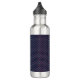 Stainless steel water bottle with a black lid, featuring a dark blue geometric pattern with small, colorful accents across the body.