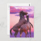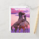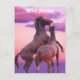 A photograph of wild stallions playing during a sunrise, displayed on a postcard. --- Photo is copyrighted by the photographer, Christina Spiegeland.