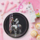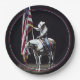 A gorgeous photograph of the cowgirl on a palomino & white Paint Horse holding the American Flag during the National Anthem at the 2014 Snake River Stampede. With a red, white and blue border. Photography and design by Robin D. Cox.