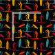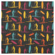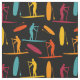 Craft the perfect gift for your favourite paddle boarder with this print fabric. The material features illustrations of paddle boarders and paddle boards in rust red, orange, yellow and teal blue set against a black background.