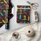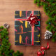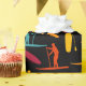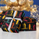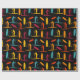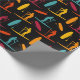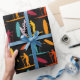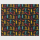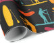 Wrap up gifts for your favourite paddle boarder in style with this fun wrapping paper. It features illustrations of paddle boarders and paddle boards in rust red, orange, yellow and teal blue set against a black background.
