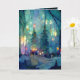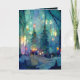 A beautiful Christmas Card with lights and a community gathering in the snowy evening woods. Watercolor in the style of Alphonse Mucha.