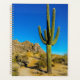 The photograph features a large multi-armed saguaro cactus by a hiking trail which leads toward a boulder strewn mountain in the Sonoran desert.