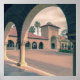The image showcases a view of Stanford University's architecture, featuring a series of arched walkways supported by columns. The foreground displays a tiled walkway leading towards a courtyard. In the background, a building with a red-tiled roof and a prominent tower can be seen, framed by palm trees. The architecture is characterized by its sandstone construction and arched openings.