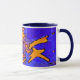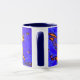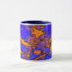 Colourful fanciful art from "Calli's Galaxy" in blues, purples and golden yellow on a cup with navy blue handle and interior. I nicknamed my dog Calli "Space Cadet" because she zoned out so much - the art is derived from the marks she left on the storm door after one of her "close encounters" trying to go THROUGH it instead of in or out. It is incredible how many stars appeared in her "nose art" - I really think she spent a lot of her time in another space. Miss that girl, but she lives on in my heart AND in the art we made together, just like Cassie (PiCassieO) does.