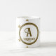 This monogram morning tea or coffee mug is a unique wedding or housewarming gift for someone special. A gold star pattern appears against a white background. Your monogram is featured in a centre circle in a golden yellow colour along with the family name. Easily customize the colours and text to suit your desire.