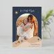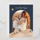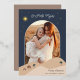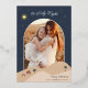 A beautiful holiday card design featuring a vertical photo in an arched layout, set on a desert background dotted with palm trees and tiny houses. The star of Bethlehem shines against the night sky in gold foil, with "O Holy Night" curved across the top. Personalize this elegant religious Christmas card design with your custom holiday greeting, family signature and the year.